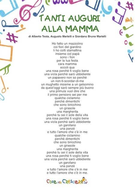 Tanti auguri alla mamma è un’allegra canzone per bambini da dedicare alla mamma per la Festa della mamma, per il suo compleanno o semplicemente per dirgli quanto gli vogliamo bene. Una canzone perfetta per la Festa della mamma scritta da Alberto Testa, Augusto Martelli e Giordano Bruno Martelli, di cui proponiamo il testo sia da leggere online che da stampare, per poterla cantare tutti insieme. Pubblichiamo inoltre un video della canzone per la mamma, interpretata dal Piccolo Coro dell’Antoniano.