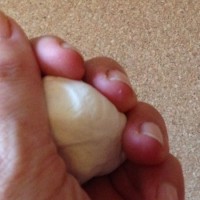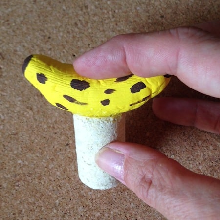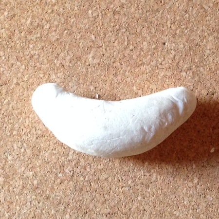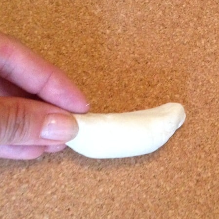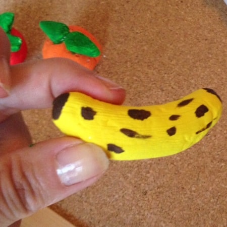 - Modellare la pasta e dare forma ai frutti. Per la banana, fare un salsicciotto corto e stringere le due estremità tra due dita, allungandole verso l’alto.