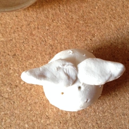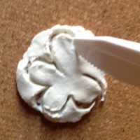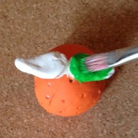 - Modellare due palline e appiattirle dando loro la forma delle foglie. Incollarle sull’arancia bagnando la parte che dovrà essere incollata. Lasciare asciugare.