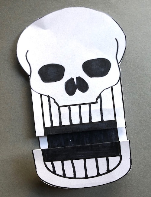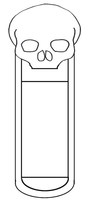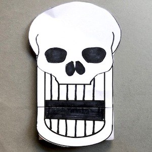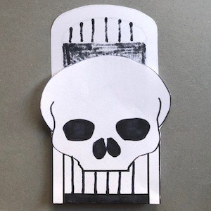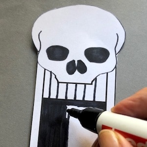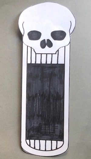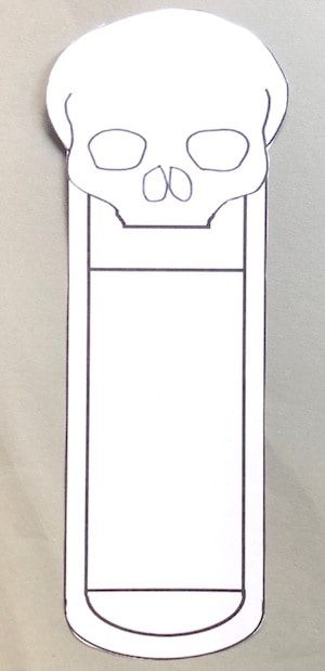 Cliccare sull’immagine della sagoma per stamparla. I bambini possono anche disegnarla: basta fare un rettangolo di circa 6 cm x 15 cm, arrotondarlo in basso e disegnare un bel teschio nella parte superiore, sul modello del nostro.