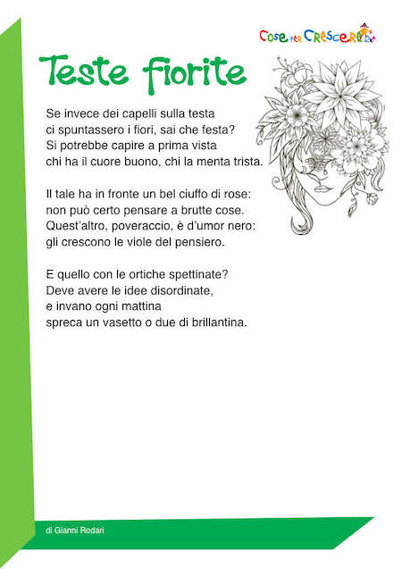 Teste fiorite è una bella poesia per bambini scritta da Gianni Rodari, una poesia facile da imparare che porta un’aria di primavera e un grande sorriso: cosa succederebbe se invece dei capelli che abbiamo in testa ci spuntassero dei fiori?