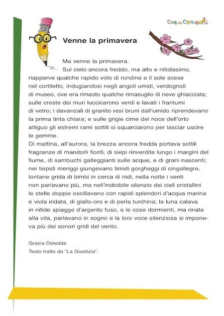 Un testo sulla primavera tratto da “La Giustizia” di Grazia Deledda, da proporre ai bambini come dettato, come lettura, per un’analisi e comprensione del testo. Un testo adatto ai bambini che frequentano le classi quarta e quinta della scuola primaria che proponiamo inoltre in una versione da stampare.