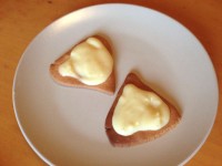 • Con la punta di un cucchiaino da caffè, fate due palline di crema pasticcera per gli occhi e una pallina per il nasino.