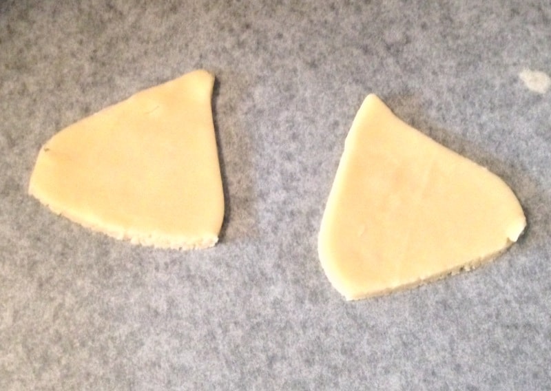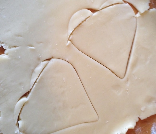 • Ritagliate dei triangoli di pasta frolla. Ho usato degli stampini a forma di cuore che ho poi modificato a triangolo.