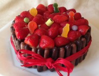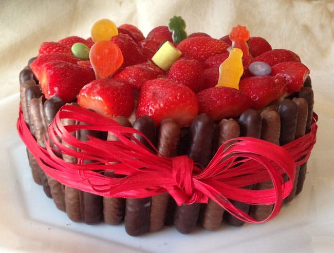 Una torta molto scenografica ma facilissima da fare in casa. A seconda del numero d’invitati, potete decidere se preparare una torta utilizzando uno stampo non troppo grande ma dai bordi alti oppure se preparare due torte (in due stampi più larghi) che sistemerete una sopra l’altra. Potete anche preparare questa torta usando una base di pan di spagna (invece della torta al cioccolato) e ricoprendola di caramelle smarties.
