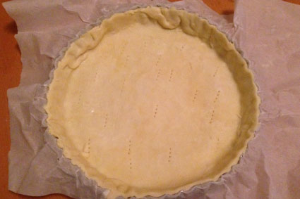 - Imburrate ed infarinate una tortiera (o ricopritela di carta da forno) e foderatela con la pasta brisée. Buccherelate il fondo con una forchetta.
