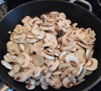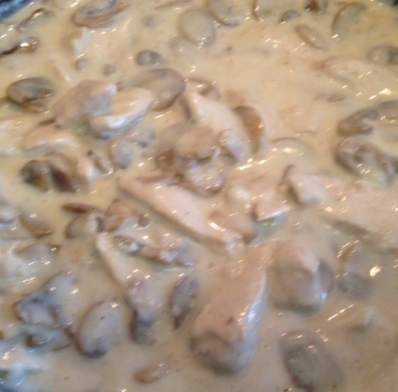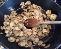 - Rimettete la padella sul fuoco e fate rosolare i pezzi di pollo a fuoco vivo. Dopo circa 6 mn, abbassate la fiamma e aggiungete i funghi. Aggiungete la béchamel, le foglie di basilico sminuzzate, salate, pepate e spegnete il fuoco e lasciate riposare.