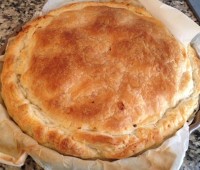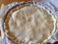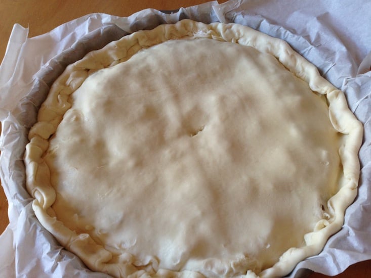 - Ricoprite con la seconda pasta sfoglia, incollando bene i bordi (inumidendoli) e ripiegandoli all’interno in modo da chiuderli bene. Con la punta di un coltello, fate un buco al centro della torta.