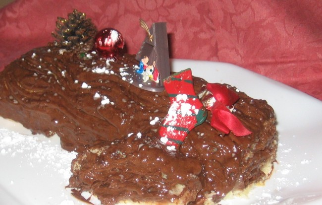 • Mettete la torta in un piatto da portata, tagliate le estremità in modo da dargli l’aspetto di un tronco, e ricopritela delicatamente di mousse al cioccolato. Passate una forchetta su tutta la lunghezza del tronchetto in modo da creare l’aspetto del legno. Decorate il tronchetto con piccoli alberi di Natale, elfi, pupazzi di neve e tutto quello che vi suggerisce la vostra fantasia…