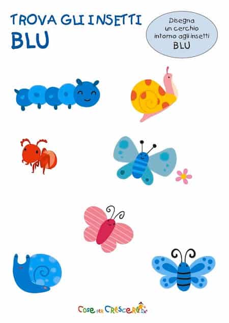 Una scheda da stampare con un’attività per imparare a riconoscere il colore blu per i bambini che frequentano la scuola dell’infanzia. “Trova il colore blu“ è un esercizio da inserire in un percorso di lavoro sui colore blu, uno dei colori primari. Per svolgere quest’attività, i bambini dovranno osservare tutti gli insetti che sono sulla scheda e segnare quelli che sono blu! Oltre ad imparare a riconoscere il colore blu, si eserciteranno a tracciare un segno circolare con precisione (il più possibile) intorno agli insetti blu, un’attività di pregrafismo.