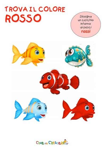 Una scheda da stampare per i bambini che frequentano la scuola dell’infanzia con un’attività per imparare a riconoscere il colore rosso. “Trova il colore blu“ è un esercizio da inserire in un percorso di lavoro sui colore rosso, uno dei colori primari. Per svolgere quest’attività, i bambini dovranno osservare i pesci che sono sulla scheda e segnare quelli che sono rossi! Oltre ad imparare a riconoscere il colore rosso, si eserciteranno a tracciare un segno circolare con precisione (il più possibile) intorno ai pesci rossi, un’attività di pregrafismo.