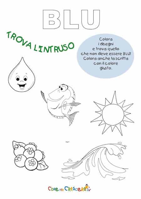 Una scheda didattica sul colore blu, per esercitarsi a riconoscerlo, per i bambini che frequentano la scuola dell’infanzia . Un gioco del trova l’intruso. In questa scheda, i bambini dovranno colorare i disegni con il loro colori e individuare quale non deve essere blu! Colorando anche la scritta del colore, i bambini impareranno a riconoscere non solo la parola ma a memorizzare i caratteri che la compongono.