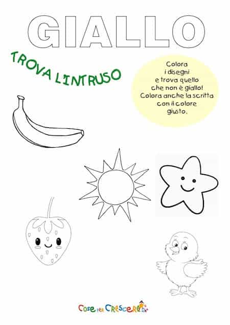 Una scheda didattica per i bambini che frequentano la scuola dell’infanzia e che stanno imparando il colore giallo. Un gioco del trova l’intruso. In questa scheda, i bambini dovranno colorare i disegni con il loro colori e individuare chi non è per niente giallo! Colorando anche la scritta del colore, i bambini impareranno a riconoscere non solo la parola ma memorizzare i caratteri che la compongono.