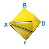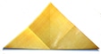 Piegare il foglio portando prima il vertice di destra su quello inferiore, poi quello di sinistra e infine quello superiore (rimasto dietro). Piegare bene in modo da ottenere un rombo.