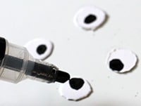 • Prendere un foglio di carta bianca. Disegnare e ritagliare 2 occhioni. Si possono anche usare occhi mobili.