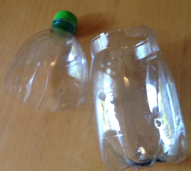 • Tagliare la bottiglia a metà. Eliminare la parte centrale più stretta (ritagliarla). Rifilare bene i bordi. Se sono taglienti, si può smussarli con un pezzo di carta vetrata.