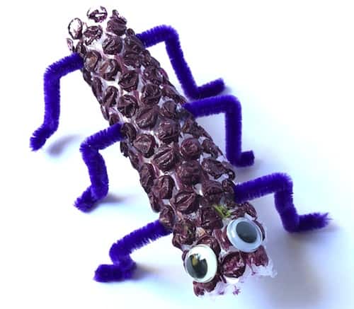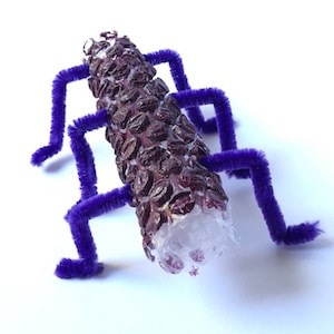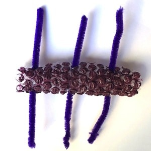 - Ritagliare 3 pezzi di scovolino per pipa viola di circa 17 cm di lunghezza e infilarli nel corpo del ragno a intervalli regolari. Saranno le zampe.