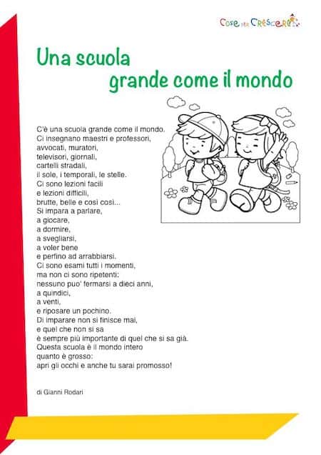 Una scuola grande come il mondo è una poesia per bambini scritta da Gianni Rodari. Una poesia per bambini, adatta alle classi della scuola primaria e ai bambini più grandi della scuola dell’infanzia, che proponiamo sia da leggere online sia in una versione illustrata con un disegno da colorare e da stampare gratuitamente.