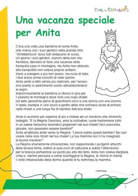 Questo racconto per bambini sulle vacanze ci racconta come una bambina di nome Anita che non voleva lasciare la città per passare le vacanze in uno sperduto paesino di montagna con la sua famiglia, cambiò idea. Una vacanza speciale per Anna è una storia per bambini da raccontare o leggere insieme durante le vacanze estive, adatta ai bambini che frequentano la scuola primaria e la scuola dell’infanzia, che proponiamo sia da leggere online che in una versione impaginata e illustrata, da stampare gratuitamente.