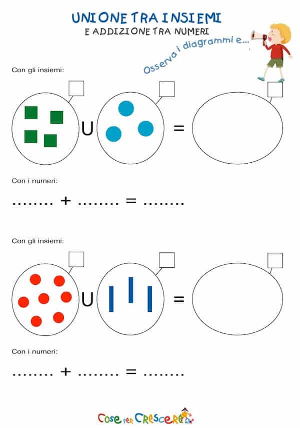 Per svolgere l’esercizio, i bambini dovranno contare gli elementi del primo diagramma, quelli del secondo e rappresentarli tutti insieme nel terzo diagramma, il diagramma del risultato dell’unione dei due insiemi. Dovranno poi tradurre quanto appena fatto in numeri! E risolvere così le loro prime addizioni.