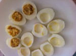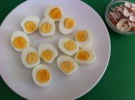• Sgusciare le uova, preferibilmente ancora calde, per tagliarle in due più facilmente. Dividerle in due nel senso della lunghezza.