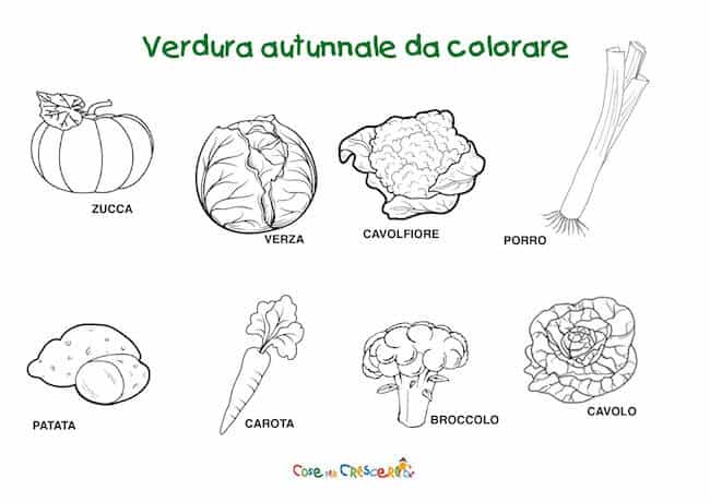 Un disegno con le verdure autunnali da colorare, per imparare la stagionalitĂ di frutta e verdura e incentivare i bambini a sapere qualche cosa di piĂą sugli alimenti. Una scheda che può essere proposta a scuola in un percorso di educazione alimentare, per capire che non tutte le verdure crescono insieme ma che seguono clima e stagioni dell’anno.
