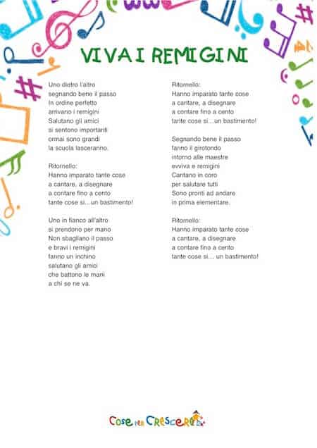 Se stai cercando altre canzoni per i remigini, prova ad ascoltare e leggere il testo di Tre anni a scuola, canzone per i remigini.