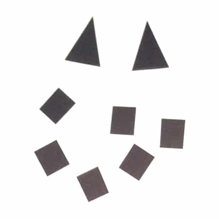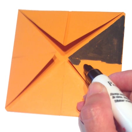 - Ritagliare 6 rettangoli di carta nera di circa 1,3 cm x 1 cm e 2 triangoli che abbiano un’altezza di circa 2 cm. Saranno i denti e gli occhi della zucca;