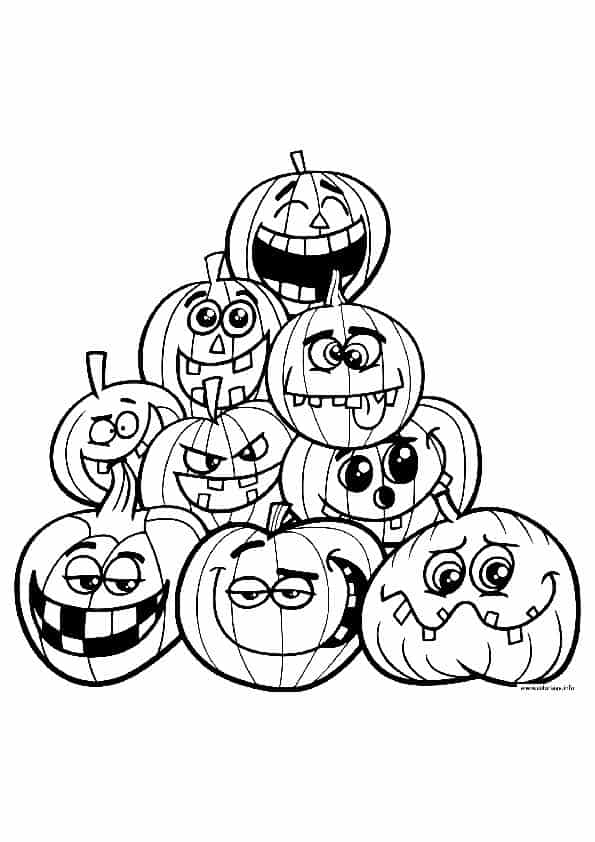 Un bel gruppetto di Zucche di Halloween disegno da colorare per bambini per prepararsi alla notte piĂą spaventosa dell’anno, la notte di Halloween che si festeggia il 31 ottobre. Un disegno da stampare gratuitamente e da colorare.
